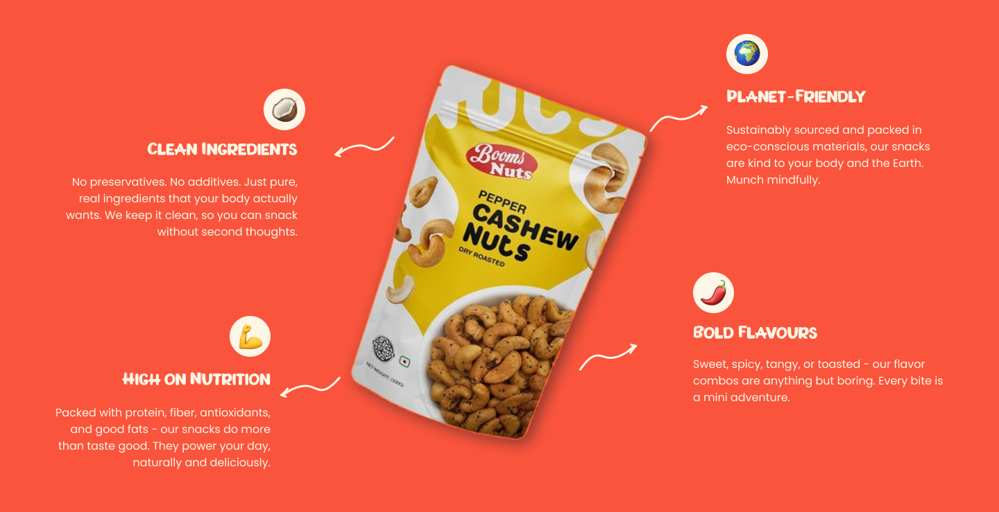 We keep it real – from handpicked nuts and sun-dried fruits to pure, natural seasonings. No preservatives, no artificial flavours, and definitely no shortcuts. Just wholesome goodness you can taste in every bite.