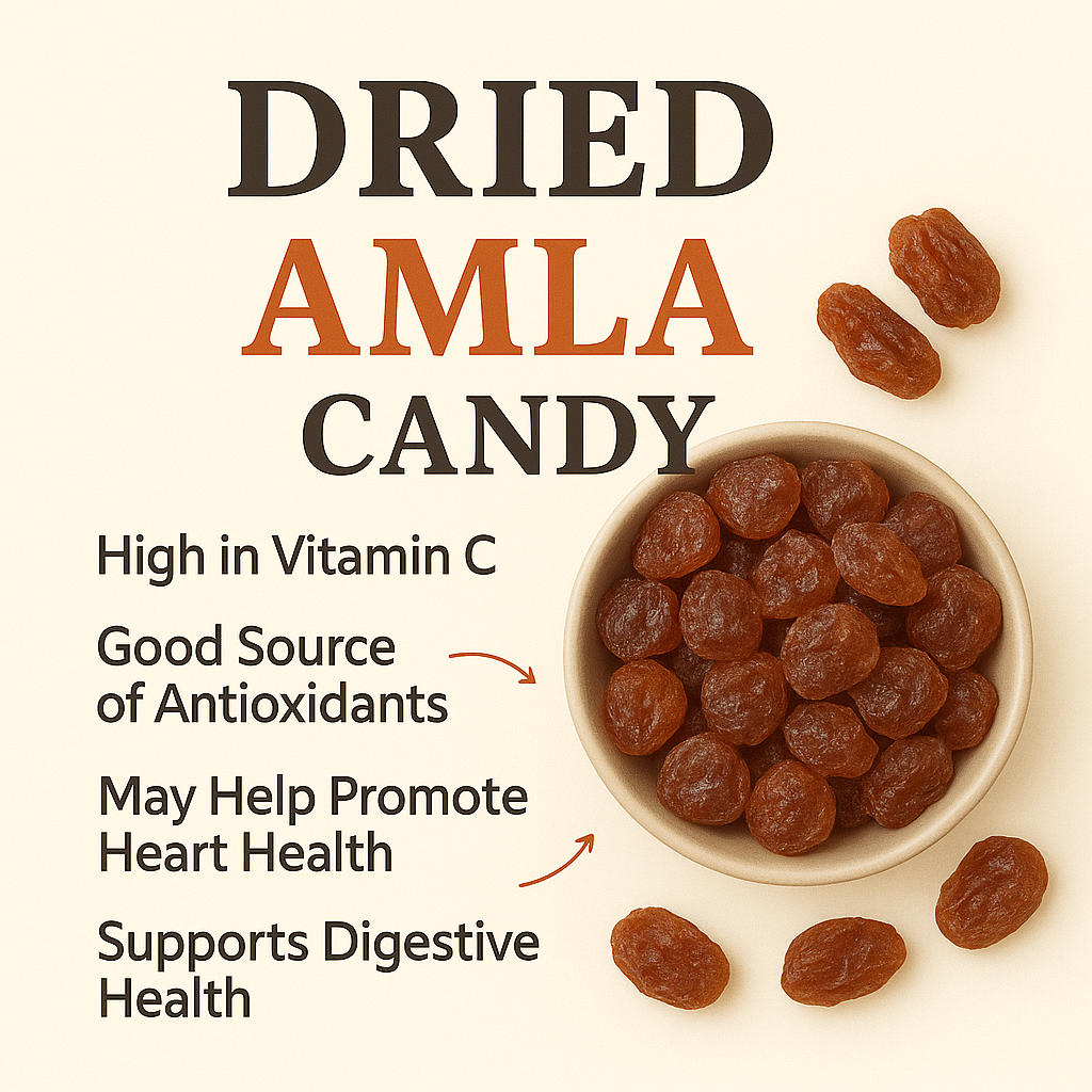 Amla candy is made from dried Indian gooseberries sweetened lightly to keep their natural tangy flavor. These candies are great for digestion, immunity, and hair health. They are fun to eat, refreshing, and a healthy alternative to regular sweets.