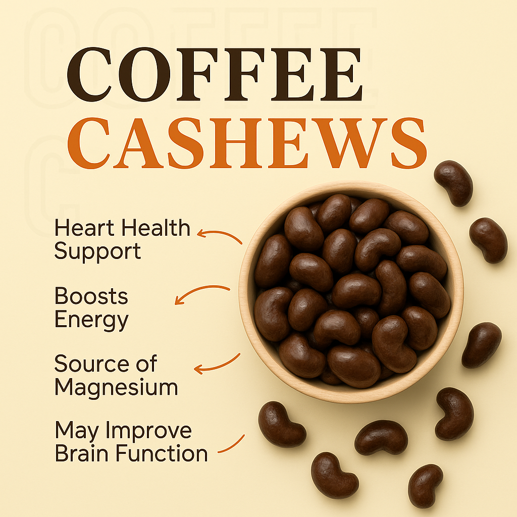 Coffee Coated Cashews are the perfect mix of strong coffee flavour and crunchy cashews. Every cashew is covered in a smooth coffee layer that smells amazing and tastes even better. The rich coffee taste makes these cashews feel like a tiny café treat. They give you energy, keep you active, and are a tasty way to enjoy cashews. These are great for coffee lovers, gifting, or enjoying during work and study time.