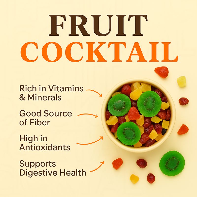 Fruit cocktail is a colorful mix of different dried fruits, each offering its own taste and health benefits. It is perfect for snacking, baking, or adding to your breakfast bowl. Nutritious, fun, and full of flavors.