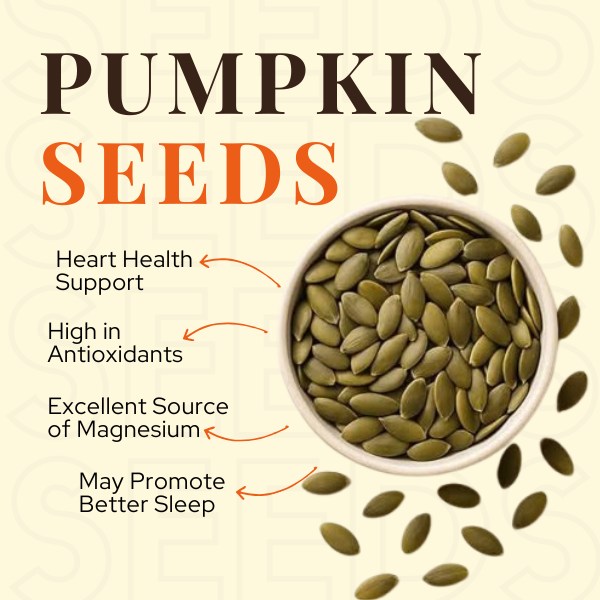 Pumpkin seeds are crunchy, mild-tasting seeds that are rich in protein, magnesium, and healthy fats. They support muscle strength, good sleep, and heart health. You can snack on them directly, mix them into salads, or add them to smoothies. Their natural crunch makes them a fun and healthy everyday choice. These seeds are perfect for kids, adults, and anyone who wants to stay active and healthy.